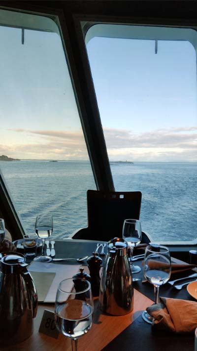 Den 19. april 2019 startet restaureringen av skipet. Og sommeren 2021 åpnet museet. Vi besøkte skipets kafe for en bedre lunsj. Så gikk vi over på hurtigruteskipet MS Trollfjord som skulle ta oss inn Trollfjorden og videre til Svolvær. Kl. 17.00 hadde vi felles middag, dessert og kaffe i skipets restaurant. Middagen bestod av buffet med masse forskjellig retter. Det var et supert tilbud som passet alle med og uten allergi. Dette var noe vi måtte få tilrettelagt før vi bestilte turen.